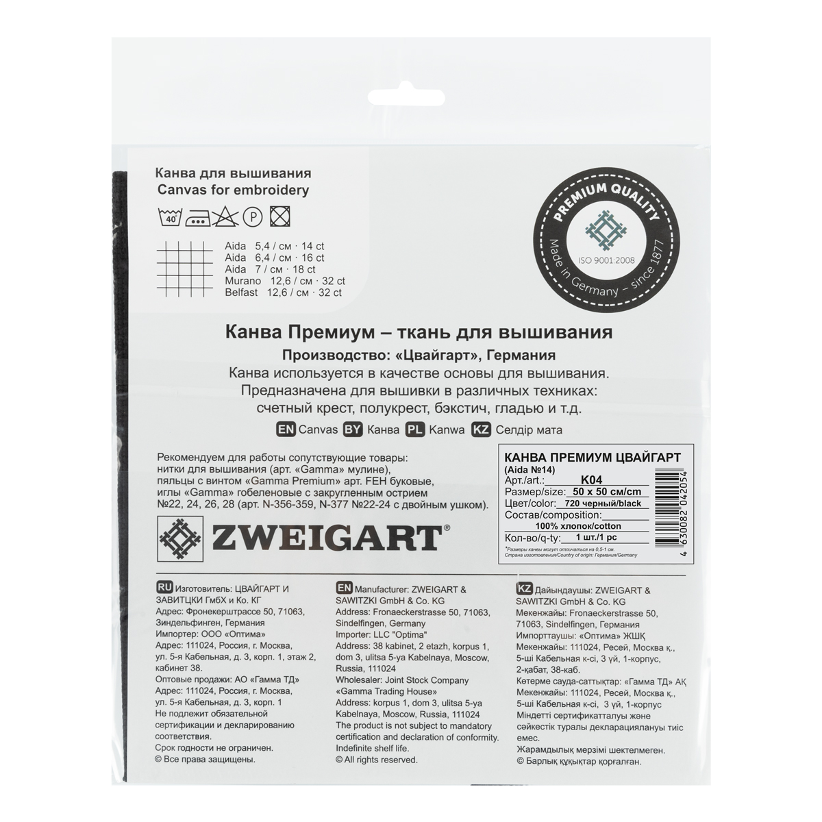 Канва К04 Zweigart Aida Premium №14 ФАСОВКА 100% хлопок 50 х 50 см ± 2 см 720 черный. В интернет-магазине ВИАЛ широкий ассортимент товаров, быстрая доставка и регулярные скидки.